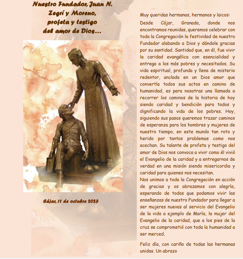 Desde Cájar, Granada, donde nos encontramos reunidas, queremos celebrar con la Congregación la festividad de nuestro Fundador alabando a Dios y dándole gracias por su santidad. ….